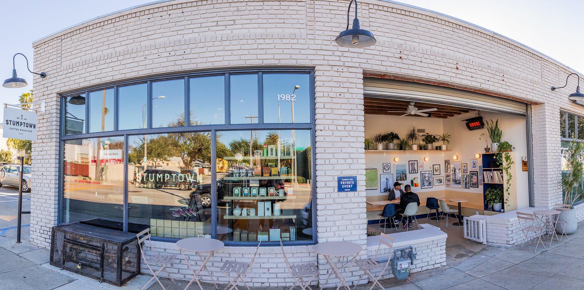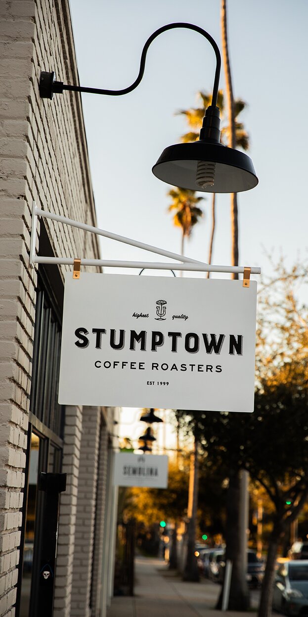 Opened in February 2024, the Pasadena cafe is an inside/outside concept, with a roll-up door that stays up during opening hours. Upon entering you are greeted by a thoughtfully curated art wall, designed by Stumptown Creative Director Hanna Boone, and a plethora of plants from floor to ceiling sourced locally from The Standard Design Group, just down the street. Local sign painter, Jenna Homen, hand-painted the gilded signage along with a larger-than-life coffee cup portrait that adorns the cafe after hours when the roll-up door is shuttered. The cafe was designed by LA-based architecture studio, wrk-shp.