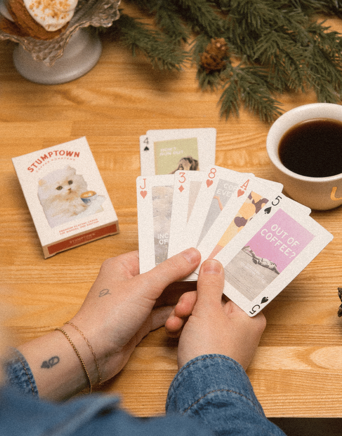Because the holidays are a weird shuffle spent with a weird lot, we created a limited-edition deck designed by Stumptown artist Tim Wenzel—who by turn, is also very weird.